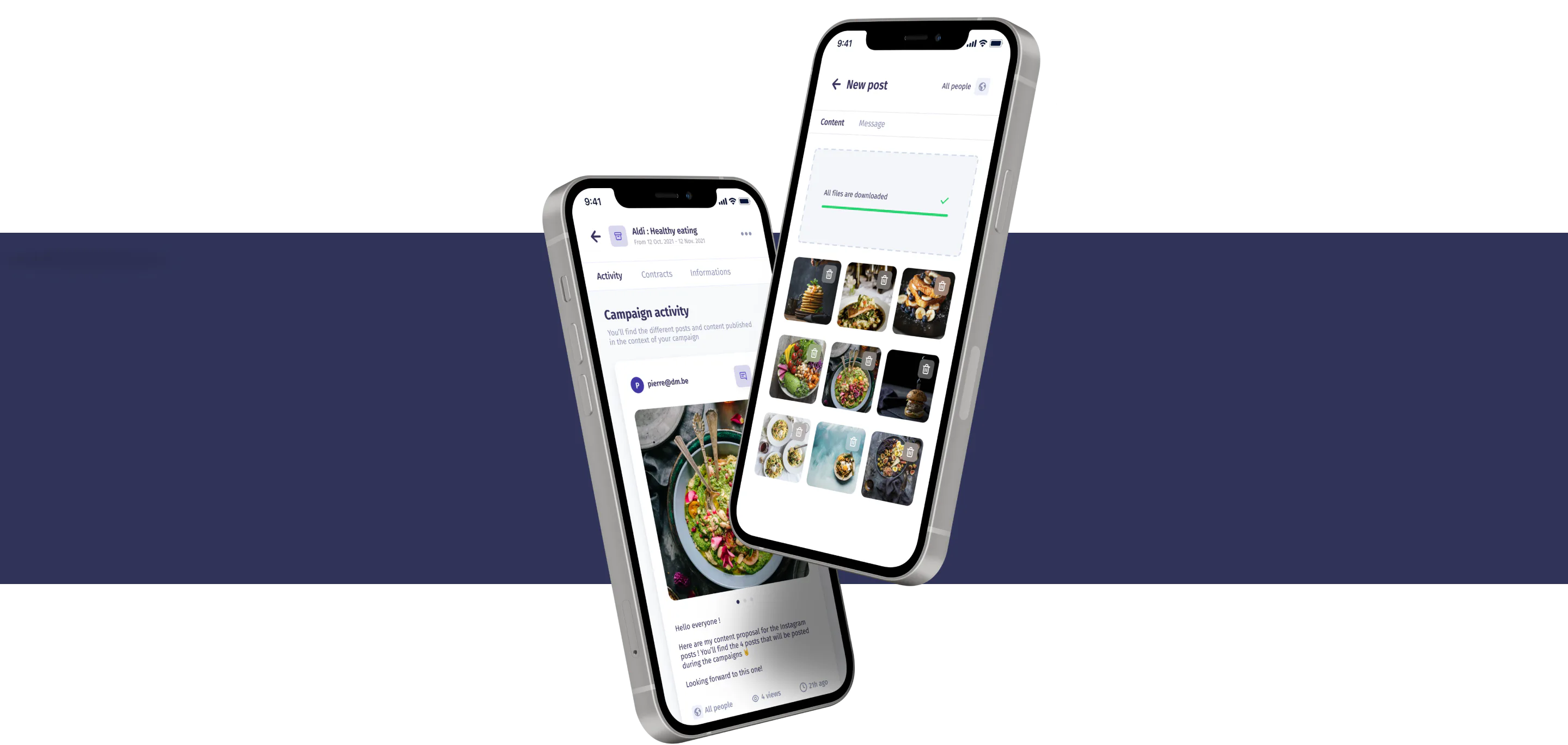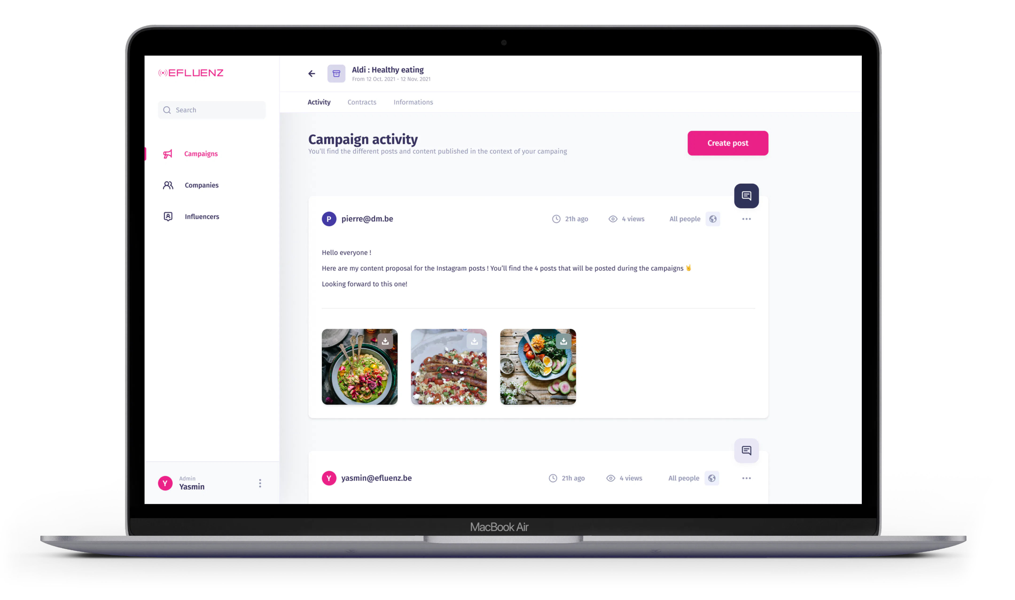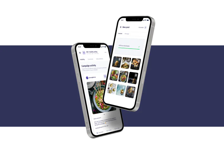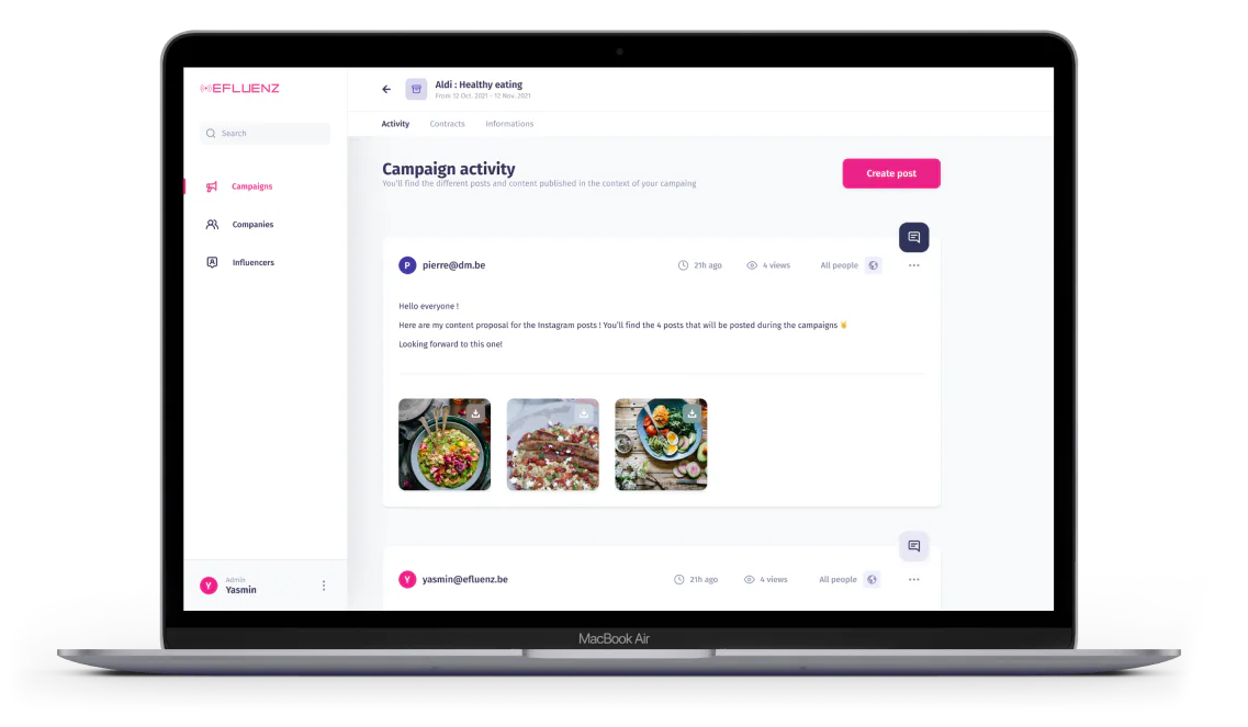 Influencers can share videos or pictures for each campaign in a centralized space on the web app. The content of this campaign is easily accessible to all stakeholders involved. Allowing the Efluenz team & clients to optimize & validate the created content before it’s published.